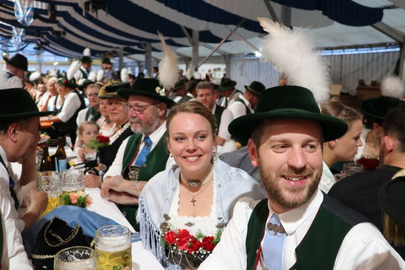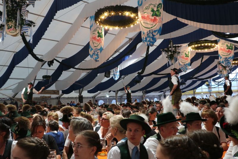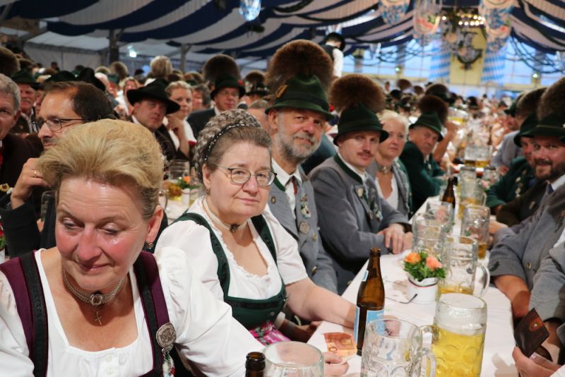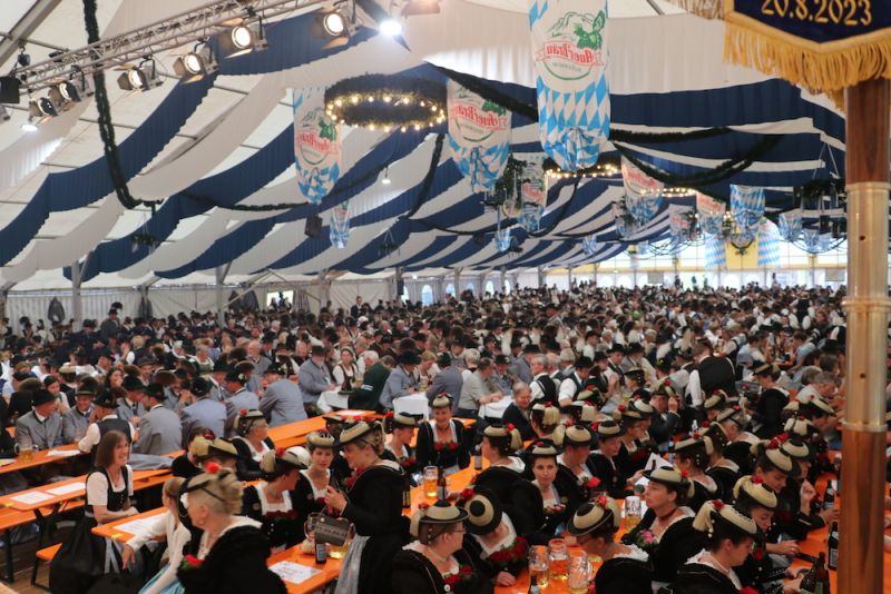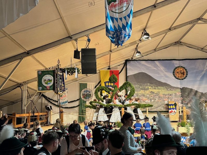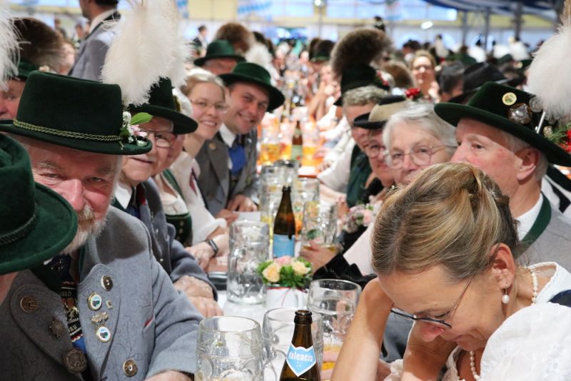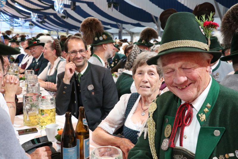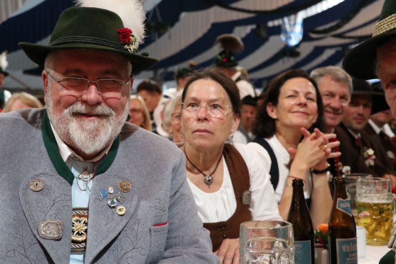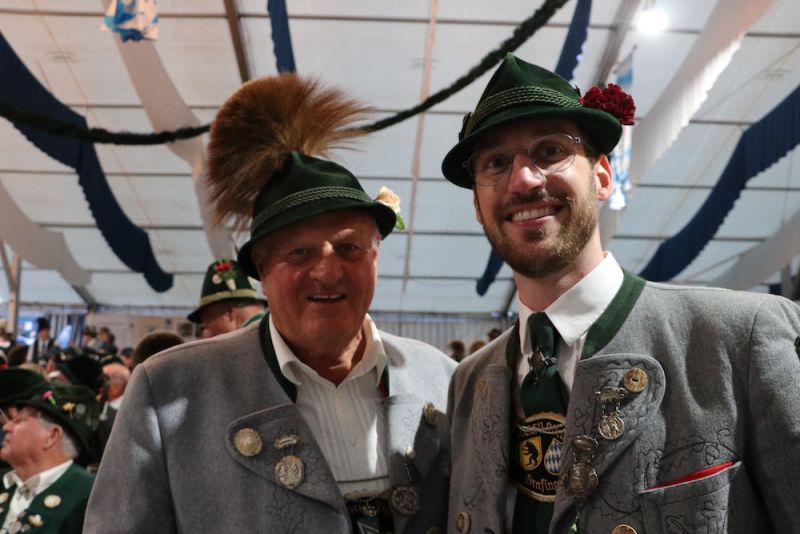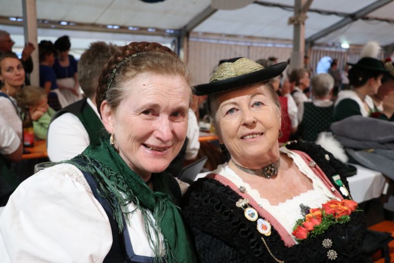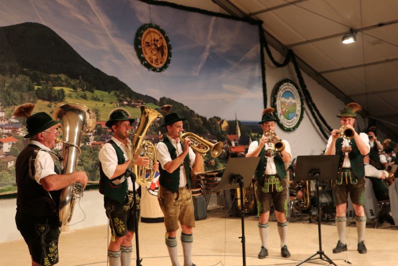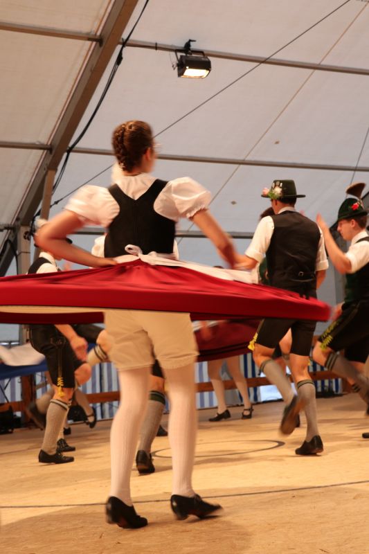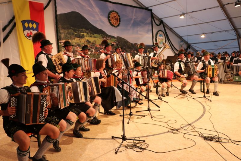 Im Anschluß sang ein Kinderchor, der aus den Plattlergruppen des Vereins besteht, zwei Lieder in baierischer Mundart, bevor der Verein die "Olympia Sternpolka" zeigte. Auch die Gaujugendgruppe zeigte ihr Können mit dem "Innsbrucker" (Plattler) und dem "Gaujugendgruppentanz". Neben den Goaßlschnalzern des Festvereins spielte ein Bläserensemble auf. Außerdem spielte eine Gruppe aus 16 Ziacherern von jung bis alt zwei Stücke. "Die haben nur ein paar Mal geprobt und können nur zwei Stücke" wurde sie vorgestellt: diese zwei Stücke waren aber trotz der kurzen Probezeit ein echter Genuß! Die beiden Patenvereine der Brannenburger "D'Jenbachtaler" Bad Feilnbach (Gau I) und "D'Kaltentaler" Pang (Inngau) zeigten den "Edelweiß Tanz" bzw. den "Kronentanz" - und freuten sich sichtlich, daß sie bei ihrem Göd auftreten konnten. Natürlich durfte auch die Gaugruppe nicht fehlen: sie zeigten den "Marquardstoana" (Marschplattler), "d'Lahn" (Plattler) und den "2012er". Ein Gemeinschaftsplattler und der abschließende "Sterntanz" des Festvereins rundeten das Programm ab. Ein Höhepunkt des "Sterntanzes" war mit Sicherheit, dass die Lichter im Zelt ausgingen - und die Sterntanzbögen zu Leuchten anfingen. Dieser moderne Aspekt des Sterntanzes passte auch gut zu einem Gedicht, daß die Ansager vorgetragen hatten: sie ließen die Künstliche Intelligenz (KI) ein Gedicht über das Platteln verfassen. "Das war jetzt arg leer und wie wenn es von jemand geschrieben wäre, der noch nie in Bayern war" so Sepp Bliemetsrieder und ließ den Vergleich mit einem Gedicht, daß von einem Plattler übers Platteln geschrieben wurde, folgen. Besonders freute sich 2.
