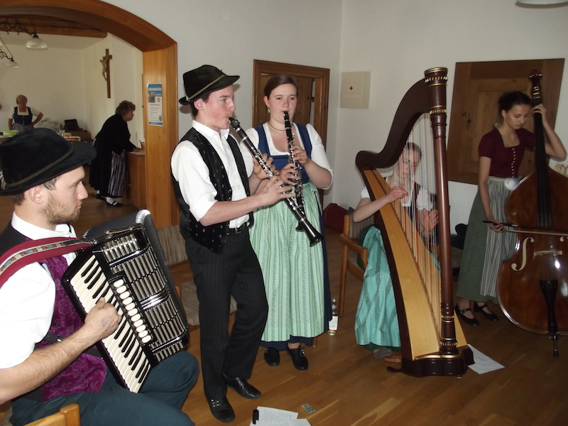 In den historischen Pfarrsaal der Altstadt von Neuötting hatte es diesmal die jungen Musikantinnen und Musikanten des Inngaus verschlagen. Gaumusikwartin Otti Schwaiger hatte eingeladen und zahlreiche Mitwirkende und Zuschauer folgten dieser Einladung, so dass der der schön renovierte Saal gut gefüllt war. Besonders konnte sie Gauvorstand Georg Schinnagl und einen Teil des Gauauschusses begrüßen. Die Trachtlerinnen und Trachtler vom Trachtenverein „Edelweiß“ Neuötting sorgten für die ausgezeichnete Verpflegung, so dass einem „griabigen“ Nachmittag nichts entgegen stand. Diesen gestalteten folgende Mitwirkende: Sechs-Zylinder Musi, Marinus Bauer Ziach und Gesang (beide Achentaler Rohrdorf), Niclas Demmelhuber, Akkordeon, die Edelweiß-Musi (beide Edelweiß Neuötting), Loadawagl-Musi (Altbachtaler Wittibreut), Dreierlei Saitenmusi (Immergrün Pfaffenhofen), Lena Übl, Ziach (Edelweiß Mitterskirchen) und die Oimröserl-Klarinettenmusi (Alpenrose Nußdorf). Durch das Programm führte die Gaumusikwartin selbst und auch das Publikum durfte mit einigen gemeinsamen Liedern beim Programm mitwirken. Höhepunkt des Nachmittags waren aber einige Anekdoten, die ein junger Hochzeitsladernachwuchs aus Rohrdorf zum Besten gab. Der Neuöttinger Vorstand Thomas Kelnhofer konnte bei seinem Schlusswort ein positives Resümee ziehen und überreicht noch jedem Mitwirkenden einen selbstgebastelten imposanten Notenschlüssel als Andenken an das Gaujugendsingen und –musizieren 2014.