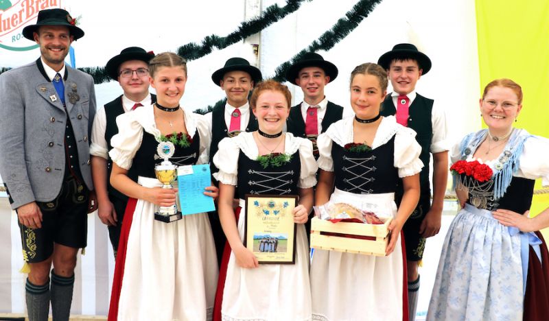 Bild 8 Sieger Jugendgruppe: vlnr 2. Gauvorplattler Rupert Treml, die Siegergruppe aus Emmering, 2. Gaudirndlvertreterin Kathrin Brem