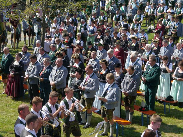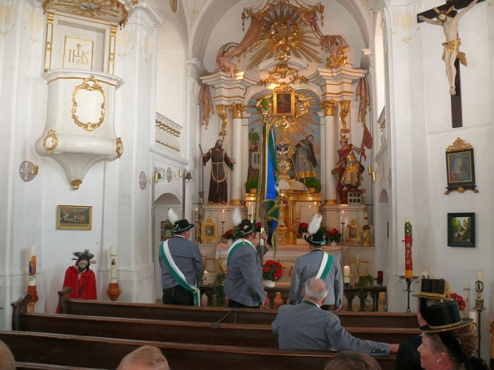 Empfangen wurden die Betenden mit Chorälen von der Musikkapelle Brannenburg, die auch die Messe und den weltlichen Teil der Gauwallfahrt hervorragend umrahmte. Als besondere Ehre empfand es Gauvorstand Georg Schinnagl, das im Jubiläumsjahr Weihbischof Bernhard Haslberger dem Inngau die Festmesse halte. Dieser bedankte sich für die Einladung und meinte scherzhaft das er für die Region Nord des Erzbistums zuständig sei und hier fehl am Platze. Bischof Haslberger beeindruckte mit eine hervorragenden Predigt und einer würdigen Messe die Gläubigen. Zweiter Gauvorstand Pankraz Perfler aus Emmering bedankte sich herzlich bei dem Zelebranten und meinte:“ Mia ham gar ned gspannt das sie für den Norden zuständig san“ , lud zu den anstehenden Festlichkeiten ein und leitete die Gauwallfahrt nach dem Singen der Bayernhymne in den gemütlichen Teil über.