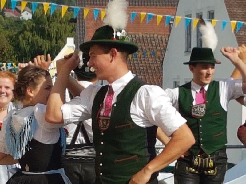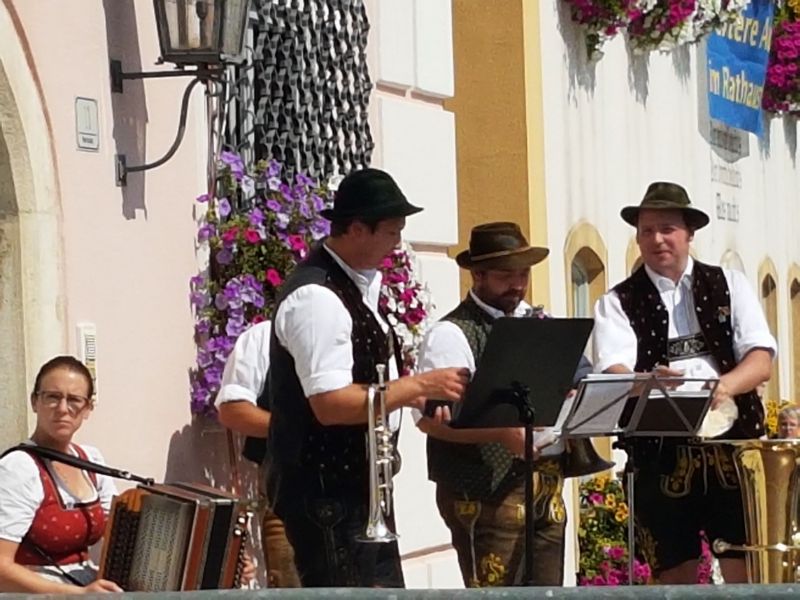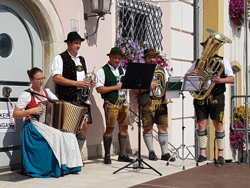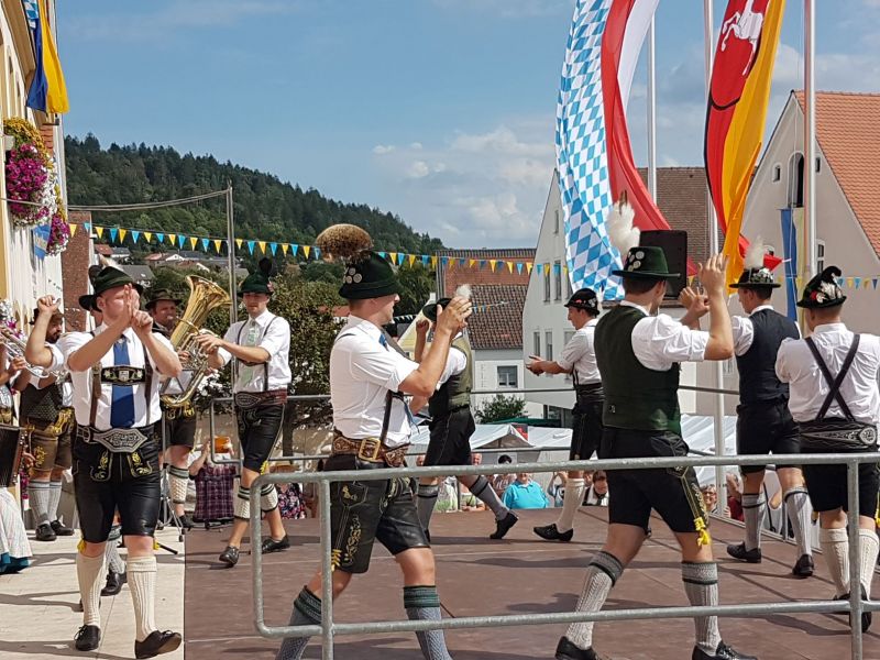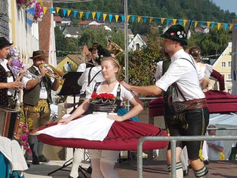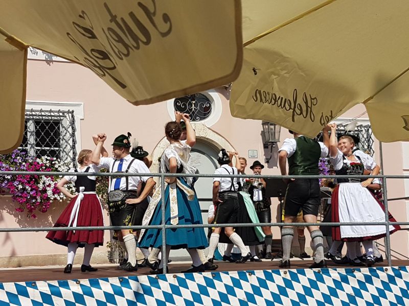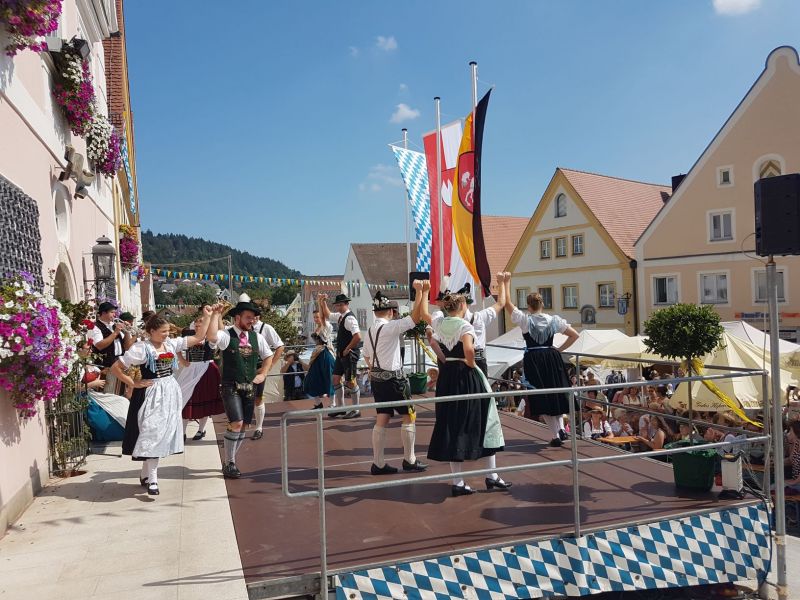 Zu den Klängen der Mitteroim-Musi zeigte auch die Gaugruppe ihr Können und lockte zahlreiche begeisterte Zuschauer an. Die große Hitze konnte den Elan der Beteiligten nicht schmälern und alle die für den Inngau im Einsatz waren, verbrachten ein eindrucksreiches Wochenende im mittelfränkischen Städtchen Greding.