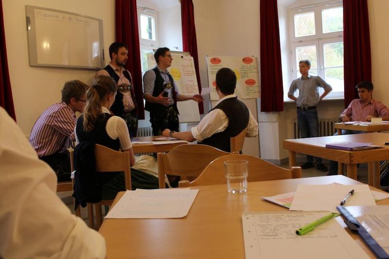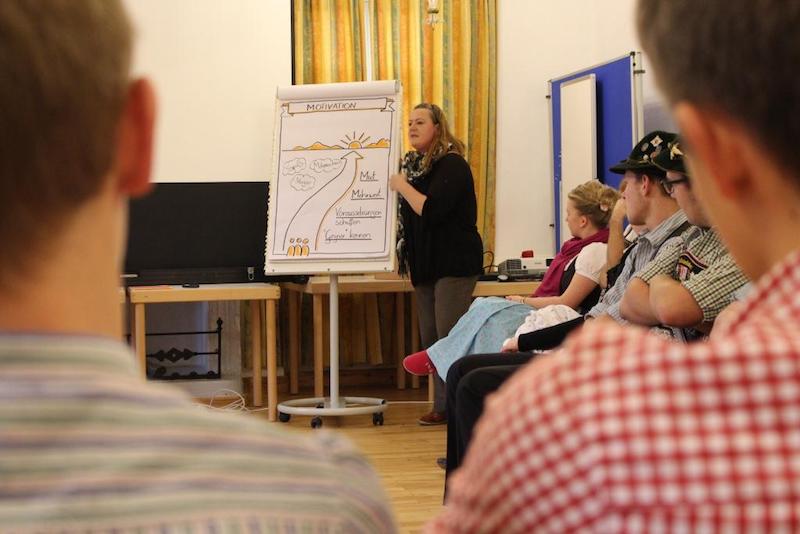 „Midnand in de Zukunft“ – unter diesem dynamischen Motto stand nicht nur eine der Gruppenarbeitsrunden, es kann auch als Leitspruch für das ganze Jugendleiter/Vorplattler-Wochenende gesehen werden, zu dem sich Anfang November rund 50 Teilnehmer ins Landschulheim Maxhofen bei Kirchdorf a. H. eingefunden hatten. Der Begriff „Motivation“ zog sich durch alle Schulungsteile und auch der Hausherr von Schloss Maxhofen trug seines dazu bei und motivierte die Teilnehmer zum pünktlichen Erscheinen beim Essen energisch mit einer weithin hörbaren Handglocke.