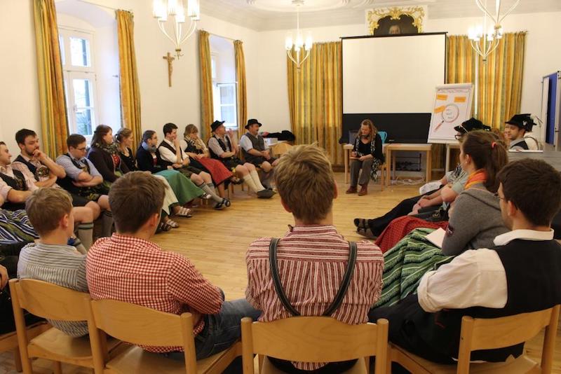 Parallel zur Schulung der Dirndlvertreterinnen und Vorplattler absolvierten 26 Teilnehmer den ersten Teil des Jugendleitergrundkurses des BTV bei Referentin Sabine Gruber. Los ging´s aber am Freitagabend für alle gemeinsam mit einem Referat von Herrn Junge von der Polizeiinspektion Bad Aibling zum ernsten Thema „Drogen und Sucht“. Diesem folgte ein lustiger Spieleabend, bei dem sich die Teilnehmer untereinander kennenlernen und auch gleich Anregungen für die Jugendarbeit daheim sammeln konnten.