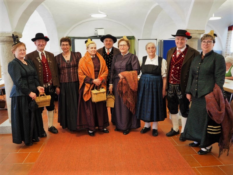 Acht Vereinsmitglieder aus Simbach a.Inn, Antersdorf und Wittibreut zeigten sich in Ihren Volkstrachten. Besonders bei den Frauen sticht die reichlich verzierte Goldhaube sowie die Riegelhaube hervor. Die unterschiedlichen Frauentrachten, sowie die Männertracht wurde von Franziska Rettenbacher ausführlich vorgestellt.