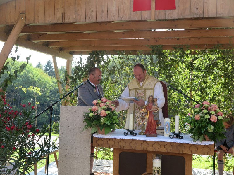 Zum Ende des Gottesdienstes bedankte sich 2. Gauvorstand Pankraz Perfler in seinen Schlussworten beim Trachtenverein und der Musikkapelle Brannenburg, die durch den Aufbau des Altares und die musikalische Gestaltung wieder zum Gelingen der Wallfahrt beigetragen haben. An Pfarrer Lederer überreichte er das Buch „Faszination Tracht“ von Walter Weinzierl und Rainer Nitzsche, so kann er sich auch nach dem bevorstehenden Wechsel in einen neuen Pfarrverband immer wieder an seine Zeit im Inntal zurückerinnern.