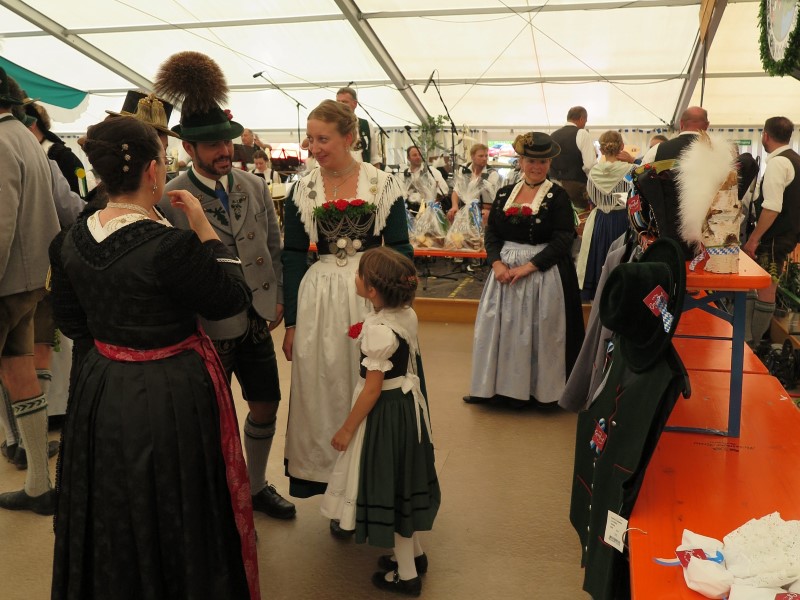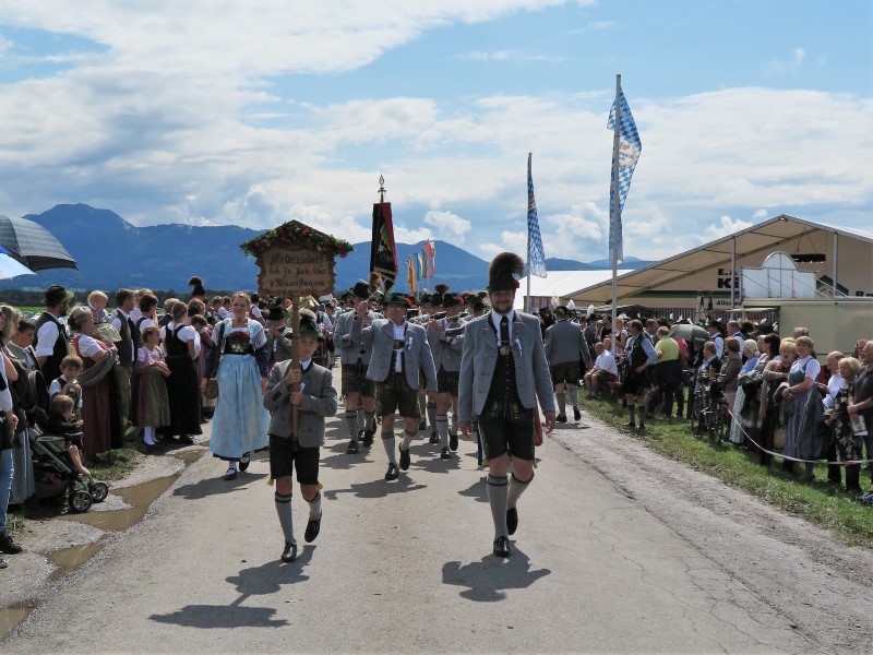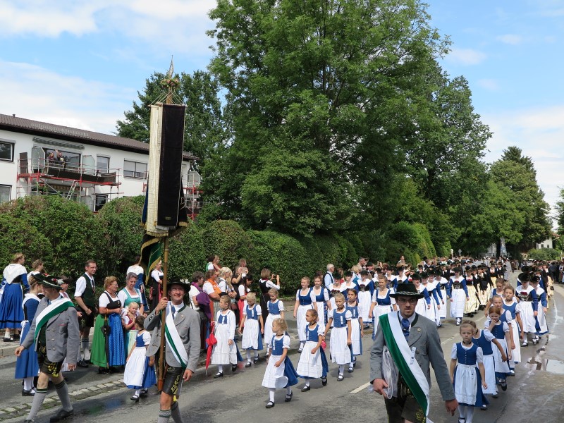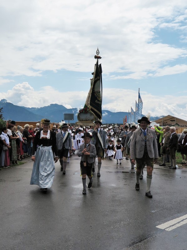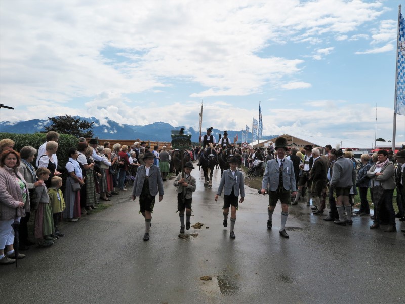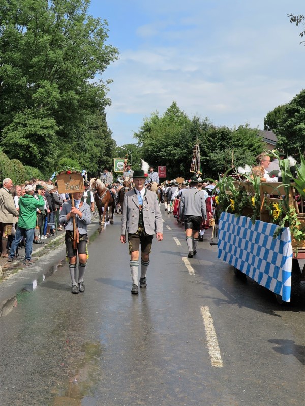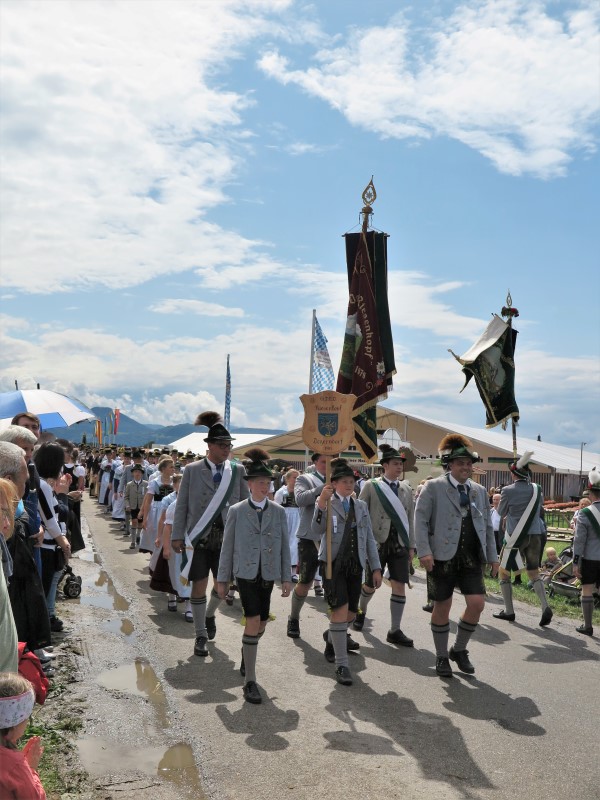 Am Nachmittag konnte 1. Gauvorstand Georg Schinnagl verkünden, dass die Wetterprognosen und Regenradare für einen verspäteten und verkürzten Festzug sprechen würden. Und tatsächlich, als sich der Festzug um 14:45 Uhr statt wie gewohnt um 14:00 Uhr in Bewegung setzte, hörte der Regen vollständig auf und die zahlreichen Besucher am Straßenrand jubelten den Trachtlern, Musikern und Festwägen zu. Alle waren froh, dass der Festzug in dieser Form stattfinden konnte und so wurde danach im Zelt noch ausgiebig gefeiert und getanzt.