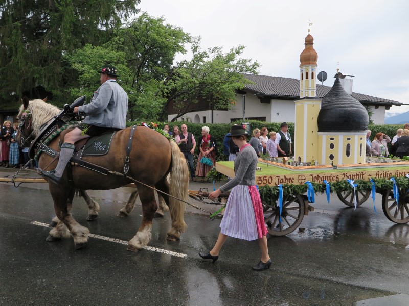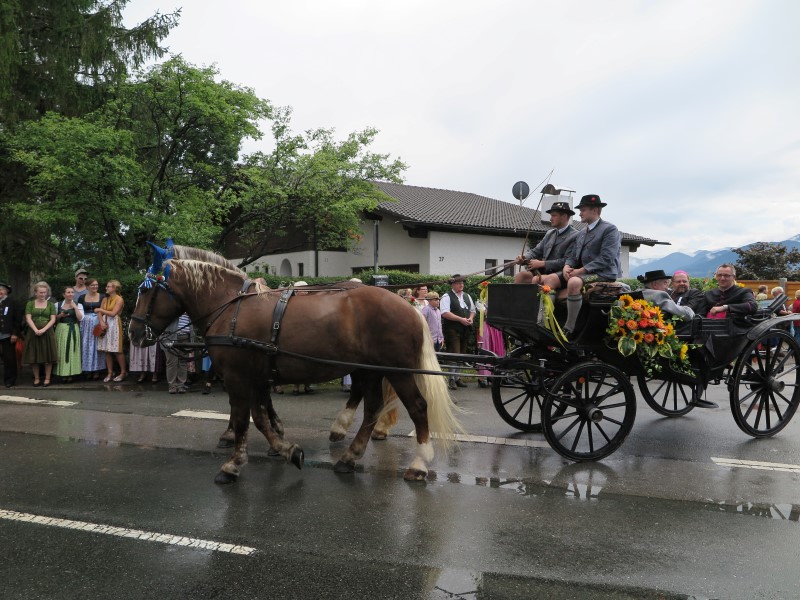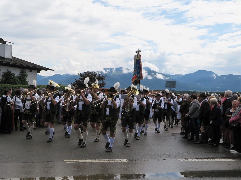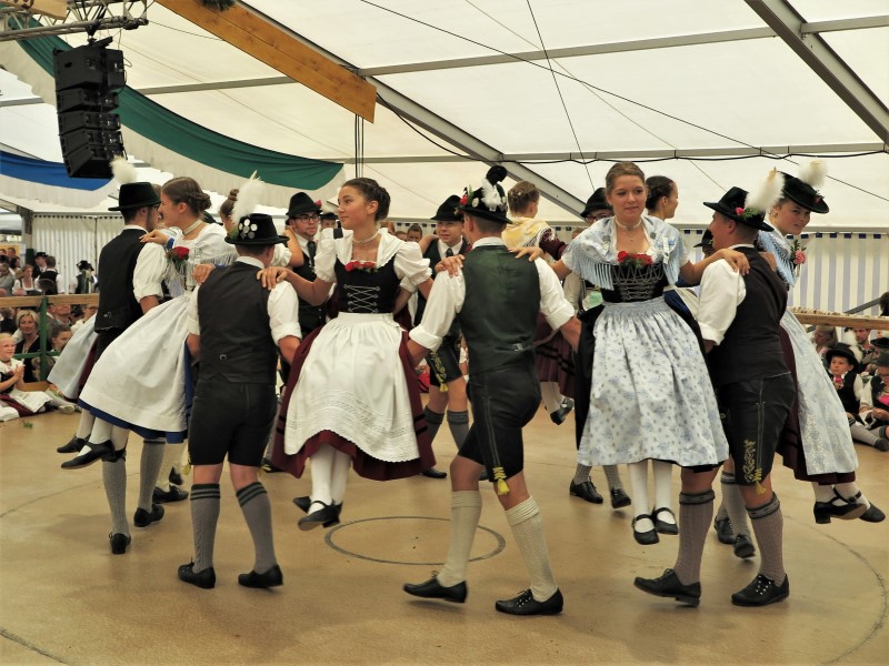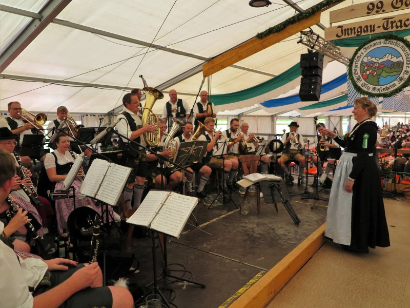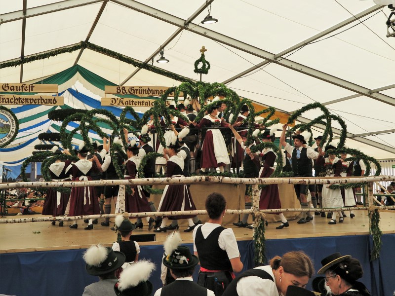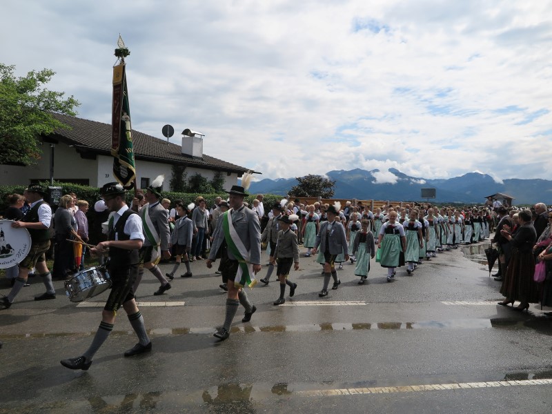 Am Nachmittag konnte 1. Gauvorstand Georg Schinnagl verkünden, dass die Wetterprognosen und Regenradare für einen verspäteten und verkürzten Festzug sprechen würden. Und tatsächlich, als sich der Festzug um 14:45 Uhr statt wie gewohnt um 14:00 Uhr in Bewegung setzte, hörte der Regen vollständig auf und die zahlreichen Besucher am Straßenrand jubelten den Trachtlern, Musikern und Festwägen zu. Alle waren froh, dass der Festzug in dieser Form stattfinden konnte und so wurde danach im Zelt noch ausgiebig gefeiert und getanzt.